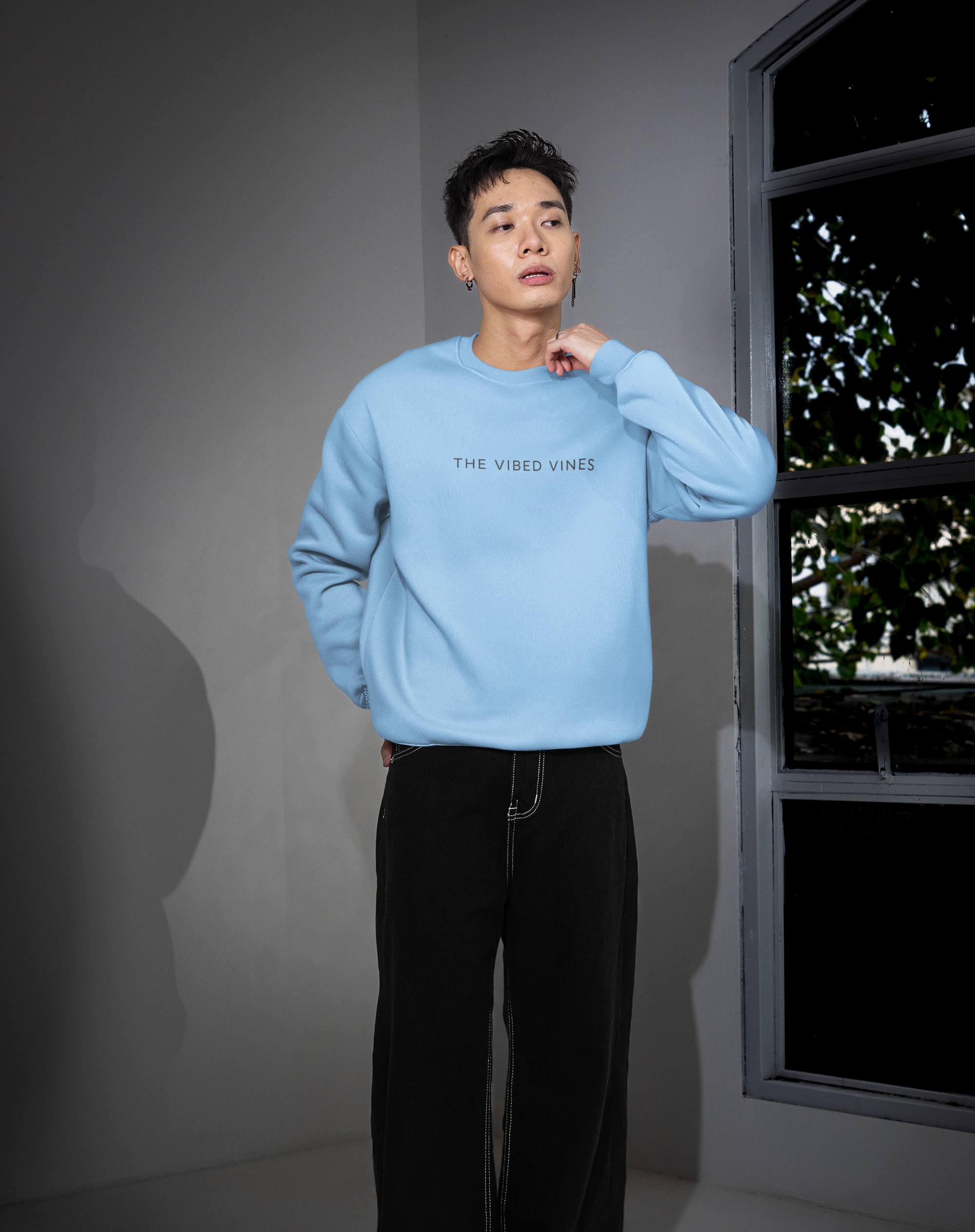 Baby Blue Oversized “WAS’ UP?” Hand Character Sweatshirt – Unisex Streetwear by Vibed Vines