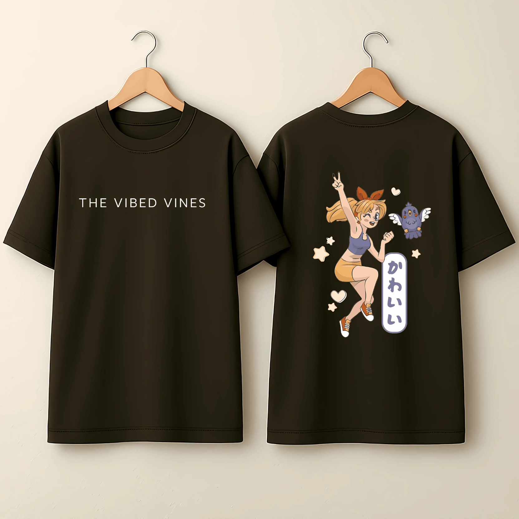 - Unique Two-Sided Design: This tee features the "THE VIBED VINES" logo on the front and a dynamic anime character graphic on the back, offering a stylish statement from every angle.
