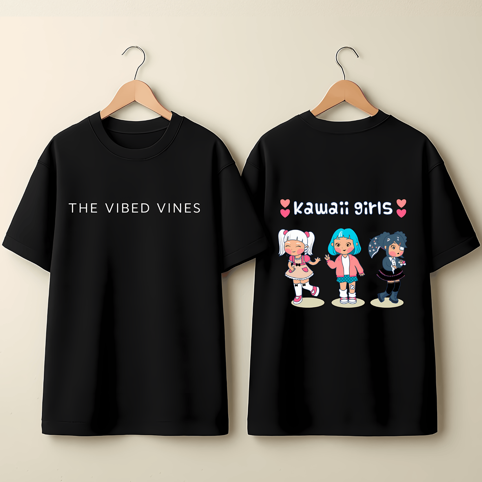- Unique Two-Sided Design: This tee features the "THE VIBED VINES" logo on the front and a charming graphic of three adorable anime girls on the back, offering a stylish statement from every angle.