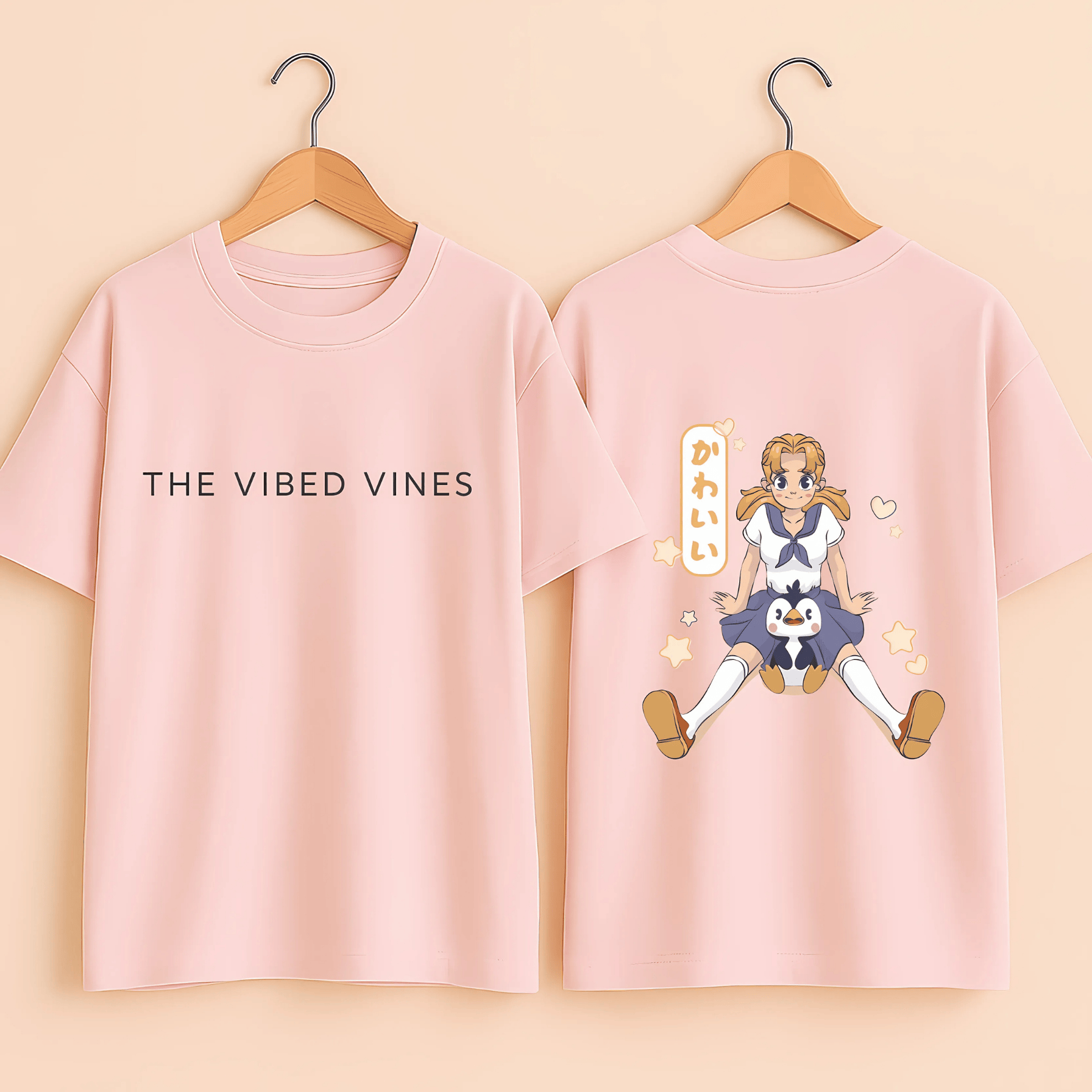 - Unique Design: The tee features a charming anime character on the back, holding a cute penguin with a "kawaii" caption, and "THE VIBED VINES" on the front. This unique design lets you show off your style coming and going.