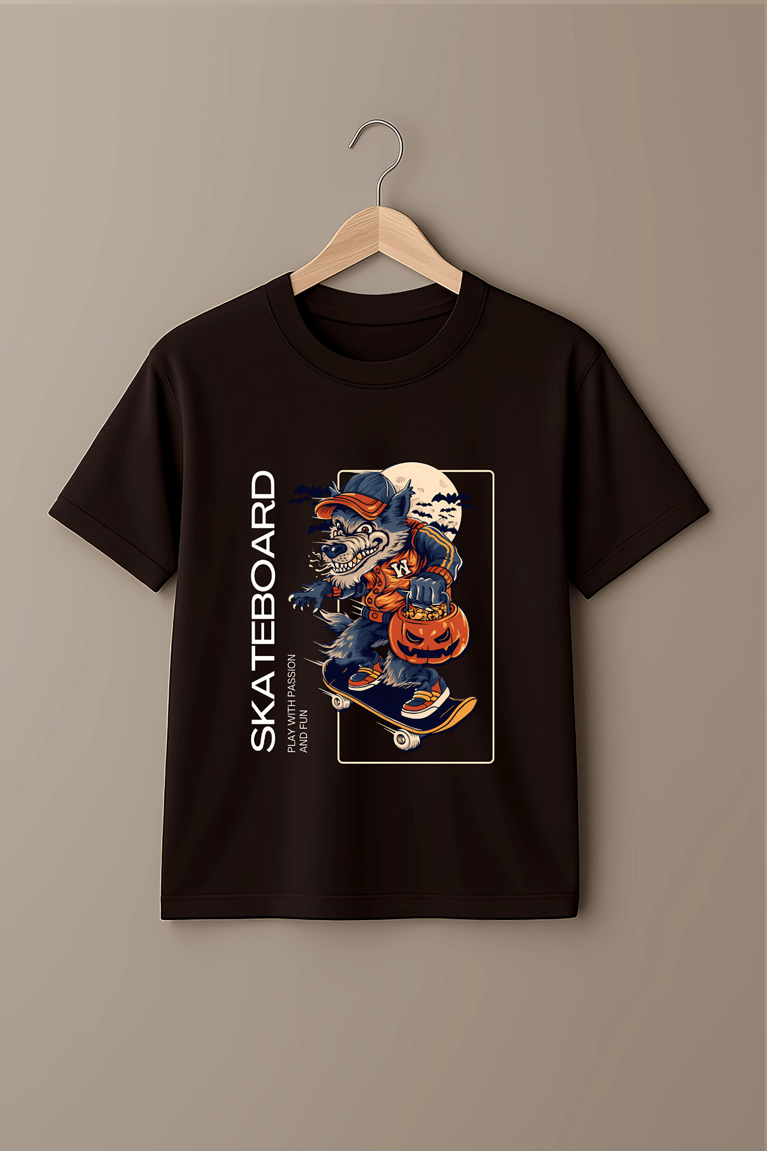 - Unique Graphic Design: Features a cool, stylized wolf character on a skateboard with a jack-o'-lantern, giving it a playful, spooky vibe. The vertical "SKATEBOARD" text and "PLAY WITH PASSION AND FUN" adds an extra layer of detail.