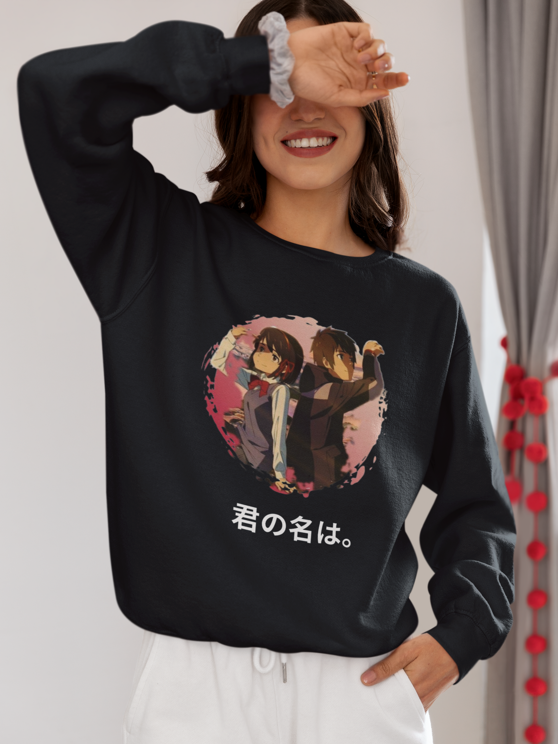 This oversized navy blue unisex sweatshirt blends premium comfort with the heartfelt artistry of the beloved anime film Your Name. The back showcases a vivid circular splash design of the two main characters standing back‑to‑back beneath a dreamy, sunset‑lit sky — a visual that captures the film’s themes of connection, destiny, and longing. The Japanese title “君の名は。” adds authentic detail for true fans. Crafted from soft, heavyweight fabric, it offers warmth, durability, and a relaxed fit that works for all‑day wear. Whether styled with jeans, joggers, or layered under a jacket, it’s a statement piece for anime lovers who want to carry a piece of cinematic magic into their streetwear rotation.