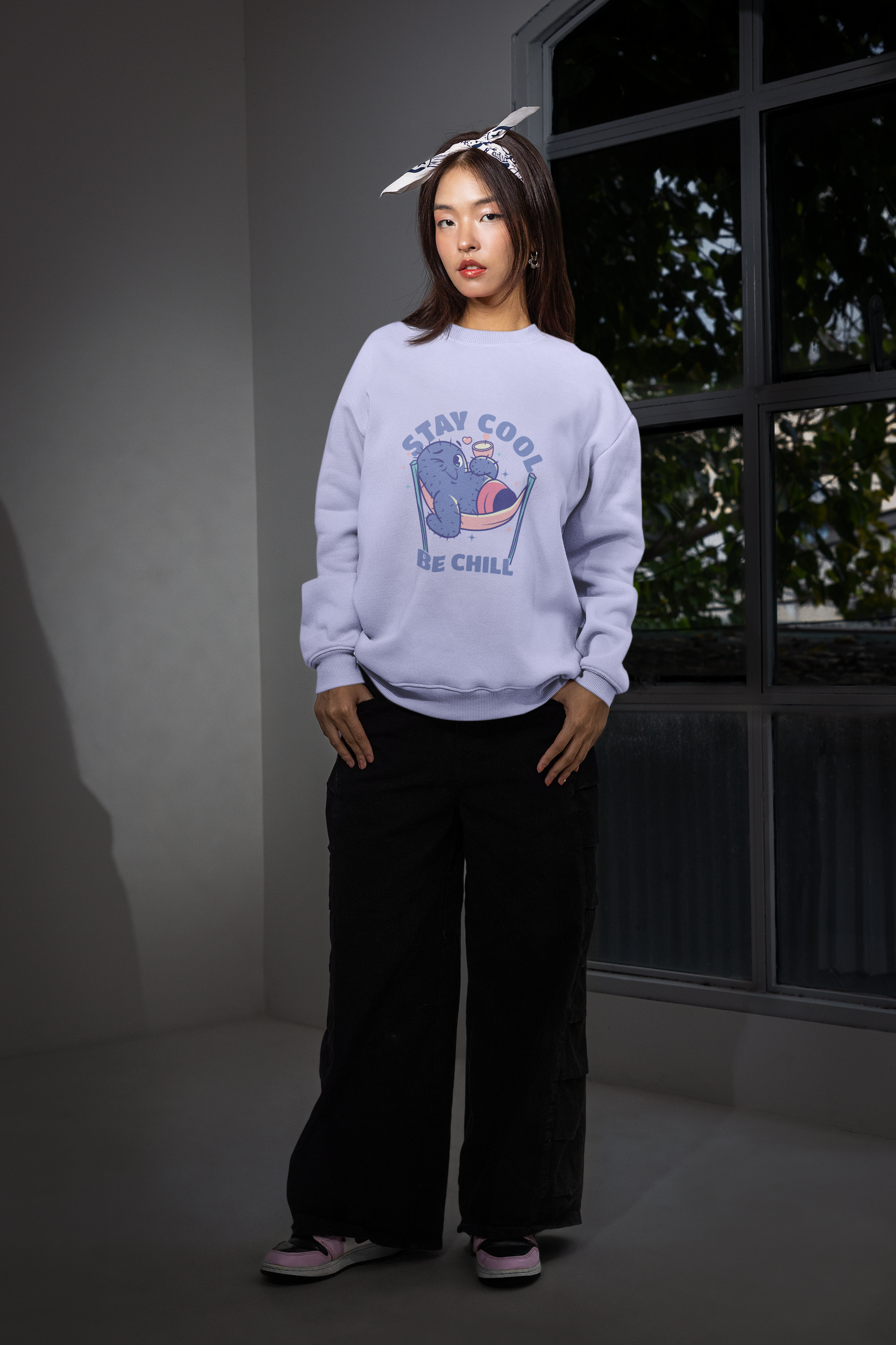 A cute, cozy, and effortlessly fun sweatshirt designed to spread good vibes wherever you go. This light purple sweatshirt features an adorable lounging seal in a hammock, paired with the playful phrase “Stay Cool, Be Chill.”